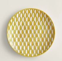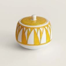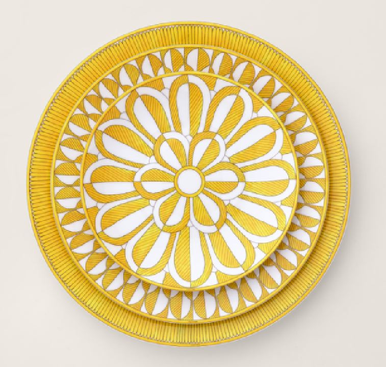 Soleil d’Hermès nous emmène dans la chaleur de l’été, sous le soleil de la Méditerranée, à l’heure où la lumière intense de l’astre vient brûler et presque effacer le contour des architectures et des objets. La main spontanée du dessin sublime le jaune en de subtiles nuances qui donnent force et profondeur à la couleur. Le trait tout en finesse des contours et des hachures vient renforcer la brûlure du soleil et son intensité. Le service déploie un jeu graphique axé sur le rayonnement, la rondeur et l’abstraction pour créer un kaléidoscope de formes et de rythmes. Ode à la douceur de l’été et à la convivialité, Soleil d’Hermès illumine la table.